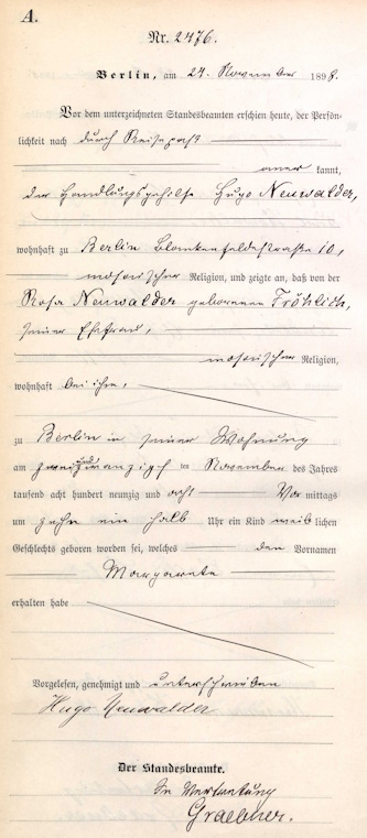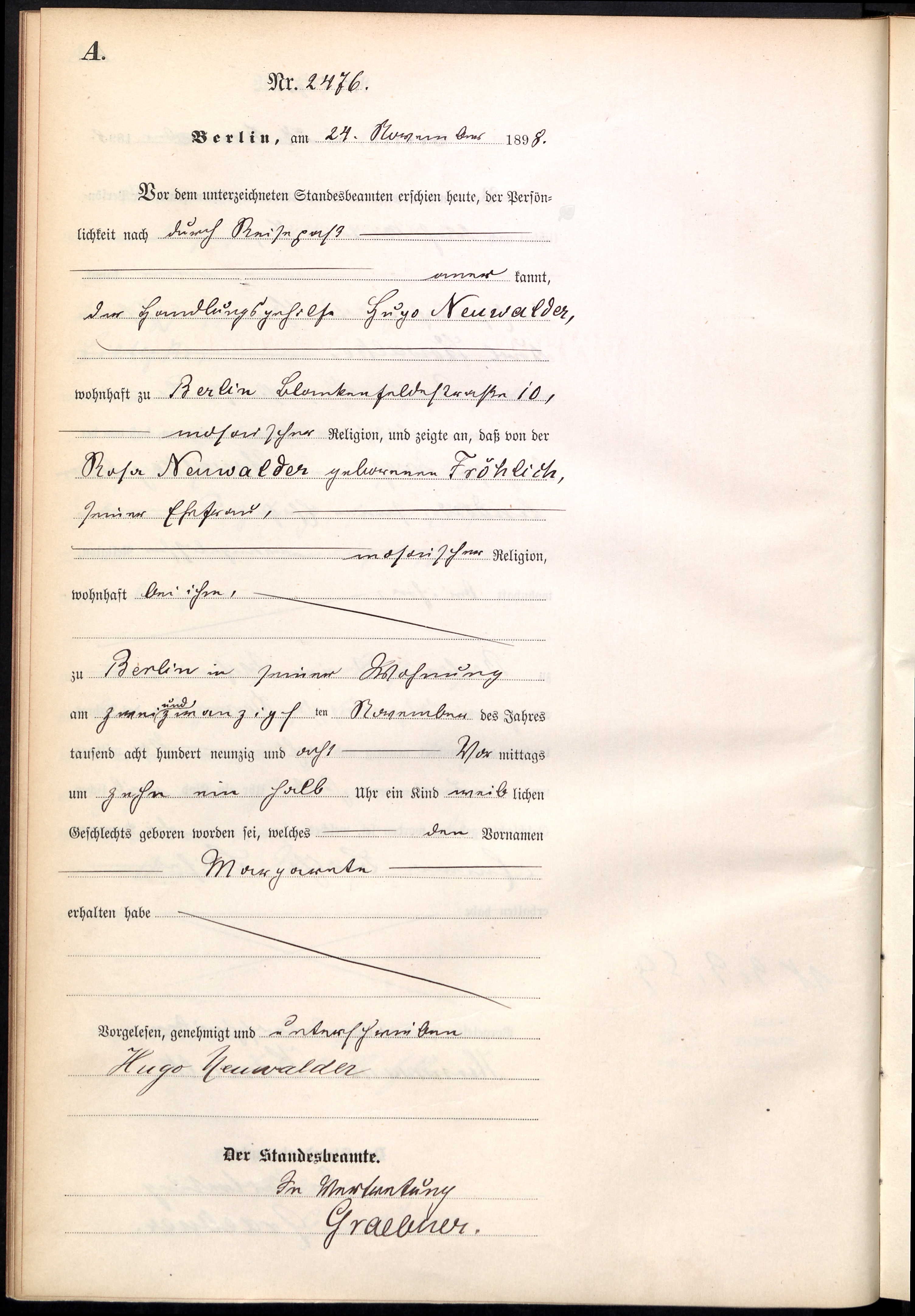 Geburtenregister (Erstregister) 1898, darin Geburtsurkunde Margarethe Neuwalder, geb. am 22.11.1898, Urkundenr.: 2476